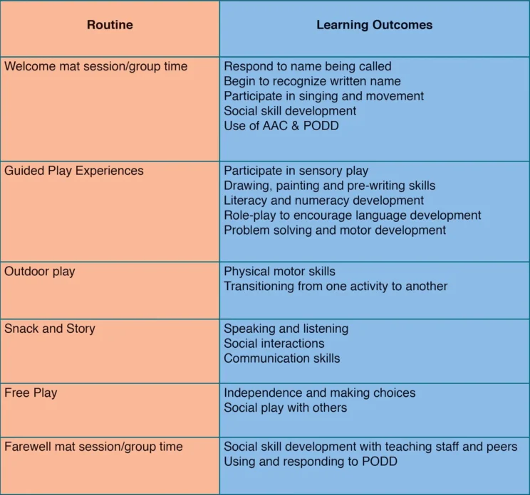 The learning experiences vary each week and focus on sensory and imaginative play. Interactions with the teaching staff encourage social skills and emotional competencies. Communication and language skills are reinforced through Alternative Augmentative Communication (AAC) strategies designed for children who are pre-verbal including Pragmatic Organisation Dynamic Display (PODD).