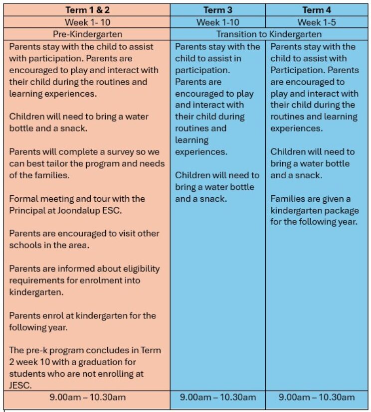 Pre-kindergarten children are 3 years old, turning 4 during the pre-kindergarten year. The program is designed for children who have a disability although formal diagnosis is not required. Preference is reserved for families living closest to Joondalup Education Support Centre who intend to enrol for their kindergarten year.